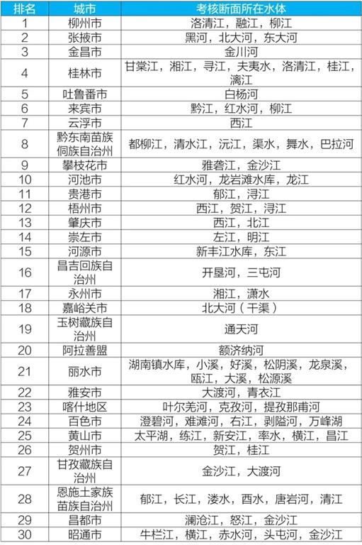 2020年10月國(guó)家地表水考核斷面水環(huán)境質(zhì)量狀況排名前30位城市及所在水體